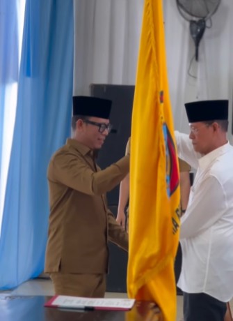 Penyerahan bendera pataka dari Bupati OKU kepada Ketua PWRI OKU, Drs. H. Supriyadi Jazid saat pengukuhan kepengurusan di Pendopo Rumah Dinas Bupati OKU, Senin (13/10/2025). -Instagram @teddymeilwansyah-