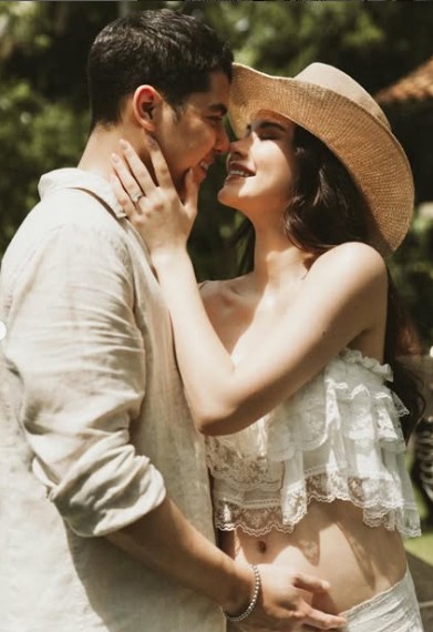 Pasangan ini tampil kompak dengan busana senada. Alyssa terlihat ceria menunjukkan baby bump-nya, sementara Al tak mampu menyembunyikan rasa haru saat mencium perut sang istri.