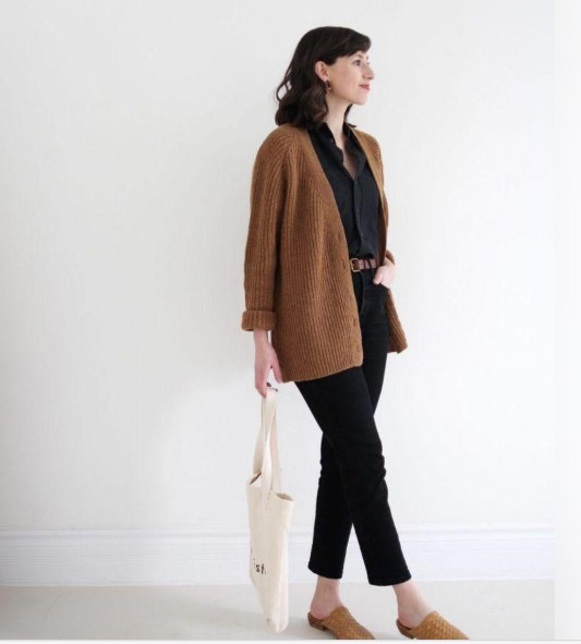 Kombinasi kemeja hitam dengan jeans hitam selalu aman. Untuk sentuhan berbeda, tambahkan outer rajut warna cokelat.